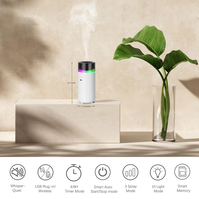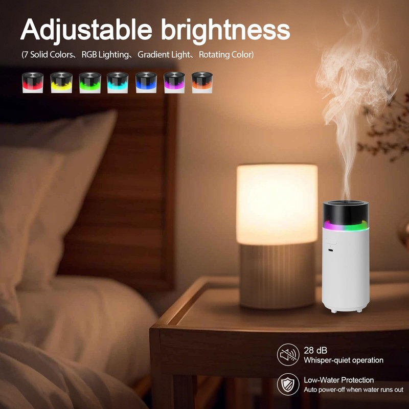 - 【Ultra-Quiet 28dB Operation & Smart Memory】:Experience near-silent misting (only 28dB) in your portable diffuser for undisturbed relaxation. Smart memory restores your last-used mist/light settings on startup