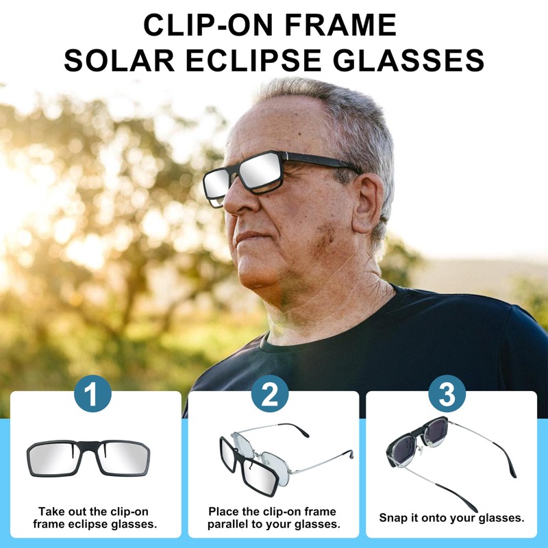- Total Solar Eclipse Glasses Set: These solar eclipse sunglasses feature two different folding points to accommodate a variety of face shapes and sizes. The clip-on eclipse lense is specially designed for those who wear glasses. You could hang the solar eclipse lenses on your glasses and observe the solar eclipse directly and clearly, which is very convenient! The eclipse glasses are also easy to use!