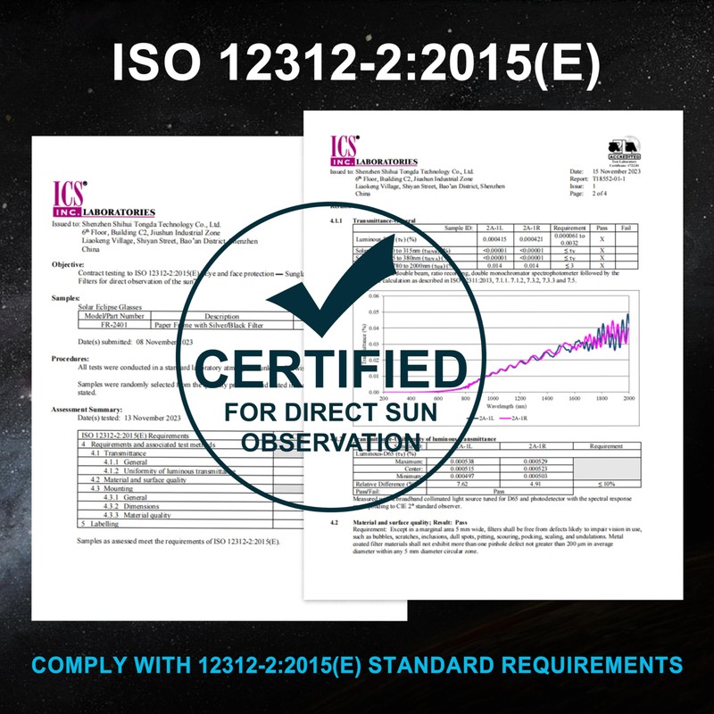 - Solar Safe Filter Technology - Our solar eclipse glasses are CE and ISO certified for direct viewing of the sun and are independently tested and verified by technical laboratories for direct viewing according to the latest standard ISO 12312-2:2015(E) Sun's filter. When viewing a total solar eclipse, you can feel confident that your eyes are safe.