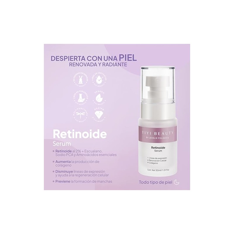 YIYI Beauty by Lesslie Polinesia Suero Facial Retinoide ayuda a estimular la producción natural de Colágeno, previniendo la aparición de los signos de la edad, así como evitar la formación de manchas, desvanecer las ya existentes.