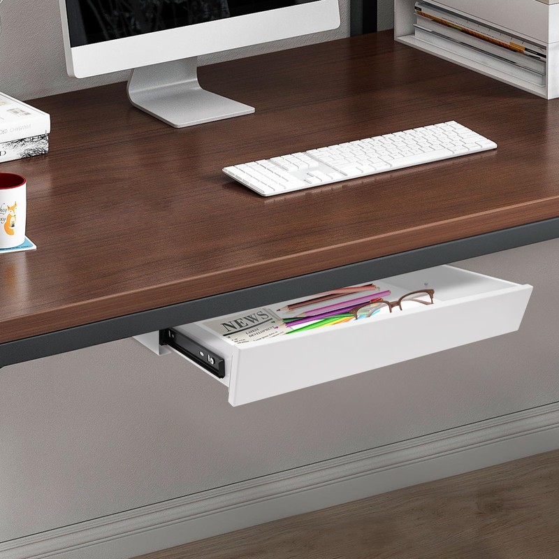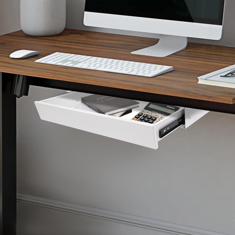 - 【Application】:It is installed under the table to store various items, such as a keyboard, mouse, books, iPad, phone, pen, pencil, glue, eraser, adapter, earphone, cosmetics, or other small items used regularly. It is designed to fit both standing desks and standard fixed-height workstations.