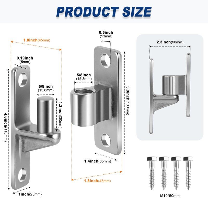 - 【Product Size】The fence gate hinges mounting aperture is 5/8'' and mounting plate thickness is 5mm. Matching screws size are M10*50mm