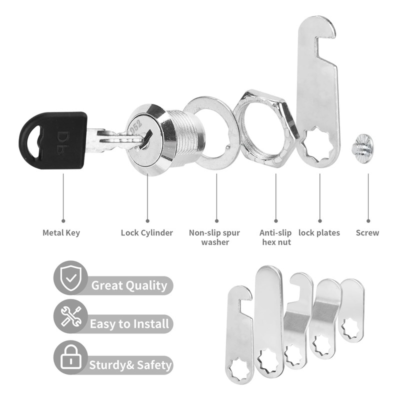 - PACKAGE INCLUDE AND SIZE: You will receive 10 pcs of mailbox lock and 20 pcs keys in total. Each lock is equipped with 2 pcs keys. Each lock equiped with 4 additional different types of locking plates to replace or satisfy your daily life. Cabinet lock length: 30mm, cabinet lock diameter: 23mm, lock plate length: 46mm, lock plate thickness: 2mm, hexagon nuts thickness: 4mm