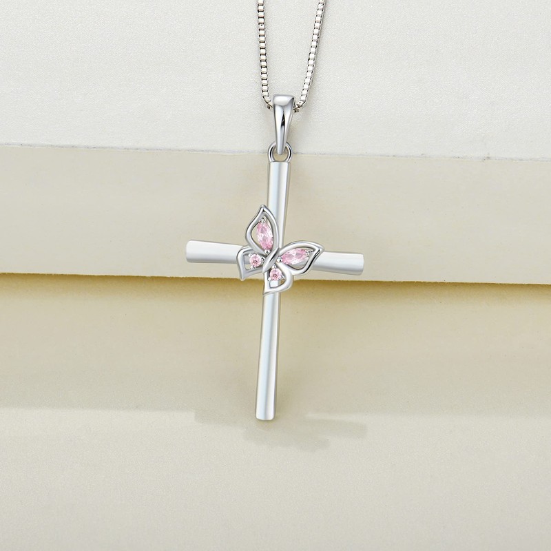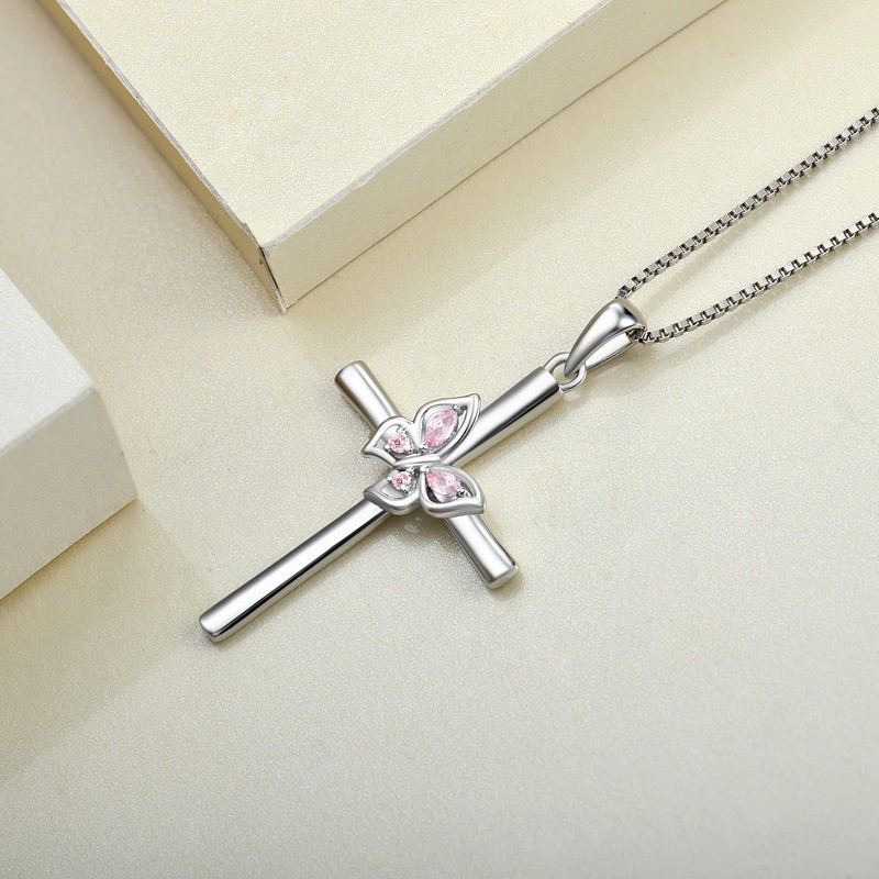 YL Butterfly Cross Necklace Sterling Silver Crucifix Pendant Created Pink Tourmaline Criss Jewelry for Women