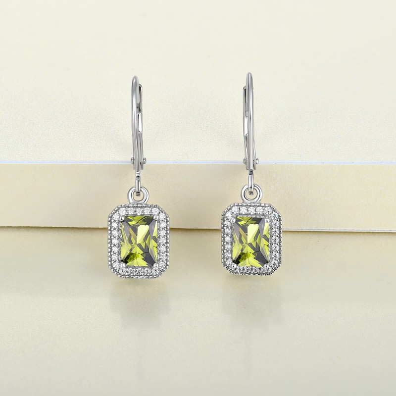 - 【DESIGN】Elegant dangle earrings cut rectangular shape bithstone. August Birthstone peridot green cubic zirconia symbolize Harmony and Happiness. Earrings size: 28MM * 9MM. Earrings Backs: Leverback.