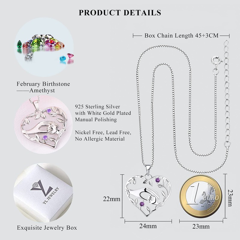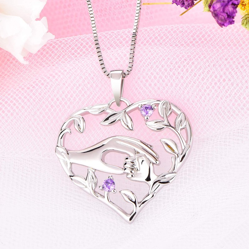 - Design: February birthstone amethyst and "mother holding children's hand" heart shape design, which expresses mother's love for child. Pendant size: 24 x 22 cm, chain length: 45 + 3 cm, adjustable.