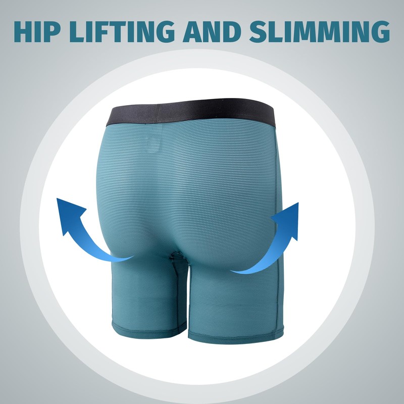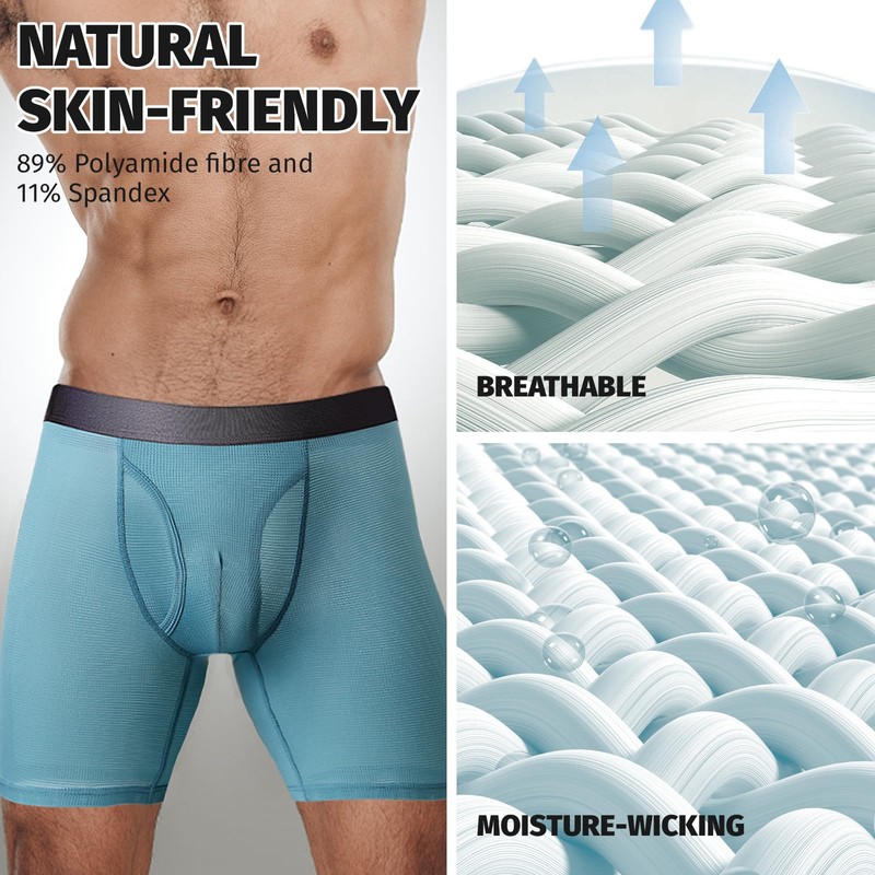 - QUEST QUICK DRY MESH LONG LEG BOXER BRIEFS 5 PACKS: Our Underwear is soft and gentle on the skin. This underwear has excellent elasticity to hug the body and provide support, cozy and breathable. This wash-and-go men’s underwear is ideal for travel. The soft and comfortable long leg boxer briefs are the ultimate no-fuss underwear for men on the go.