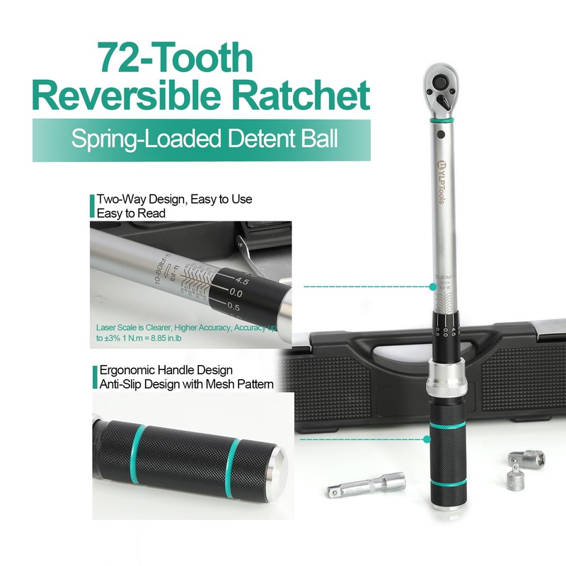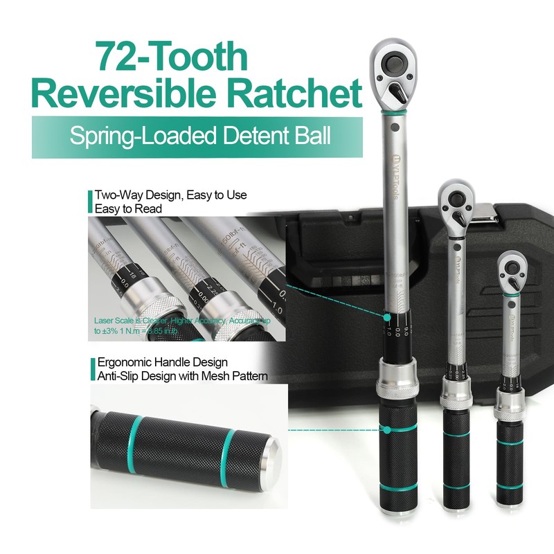 - Torque Accuracy Range: ±3% Ratchet Head: 72 teeth, material: 40Cr-Mo, surface: Manganese Phosphate Coating Locking Pin: Material: 35K, surface: Manganese Phosphate Coating Torque Plate Body: Standard, material: 40Cr, surface: Matte Finish Torque Tube: Seamless steel tube, material: 42Cr-Mo, surface: Matte Finish Aluminum Handle: Striped/Knurled, material: 6061 Aluminum