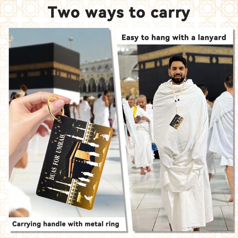 - Compact and Portable Design: The cards are bound with a metal ring and come with a lanyard featuring an Umrah-themed design, making them convenient to carry and accessible during the pilgrimage.Durable and lightweight, they are designed to withstand travel and frequent use.