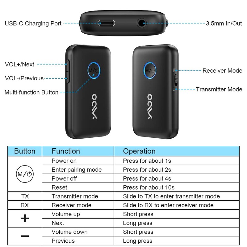 - 【22H Working Time】YMOO B06T1 upgraded its battery capacity to 400mah, support constantly working for 22H in transmit mode and 20H in receive mode; it also supports working while charging via usb-C-to-USB cable directly or supply it an additional power supply.