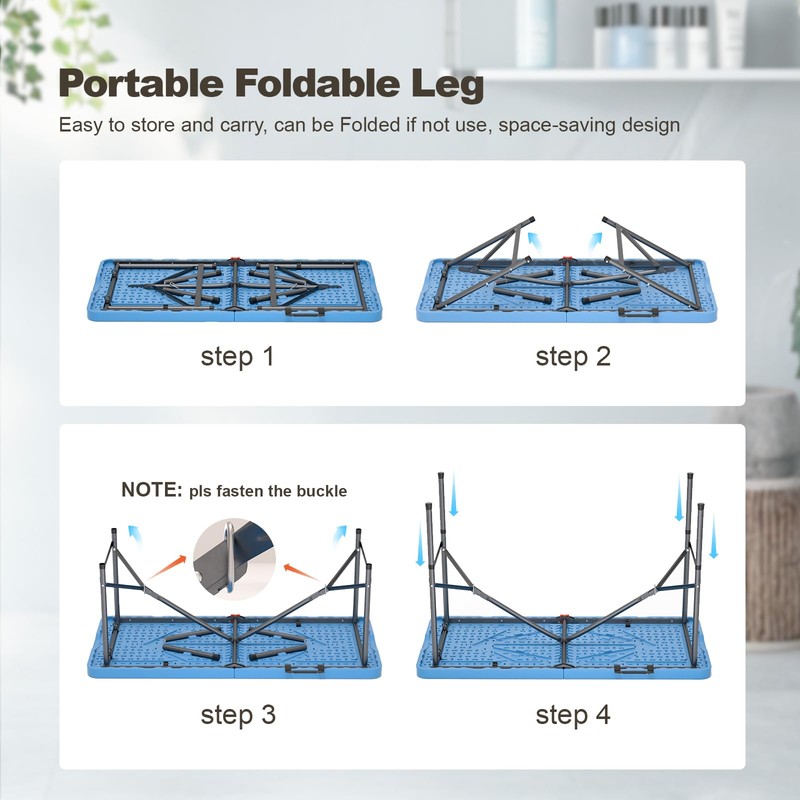 • Portable & Foldable: Weight: 12kg/26.4lbs. The table can be easily finished opening and closing, convenient for storage and transport. Step 1 - Spread the table out; Step 2 - Pull up the legs of both sides; Step 3 - After pulling open the legs, note to fasten the buckle to prevent the legs from tilting; Step 4 - finally, insert 4 legs into the table and extend the height of the table