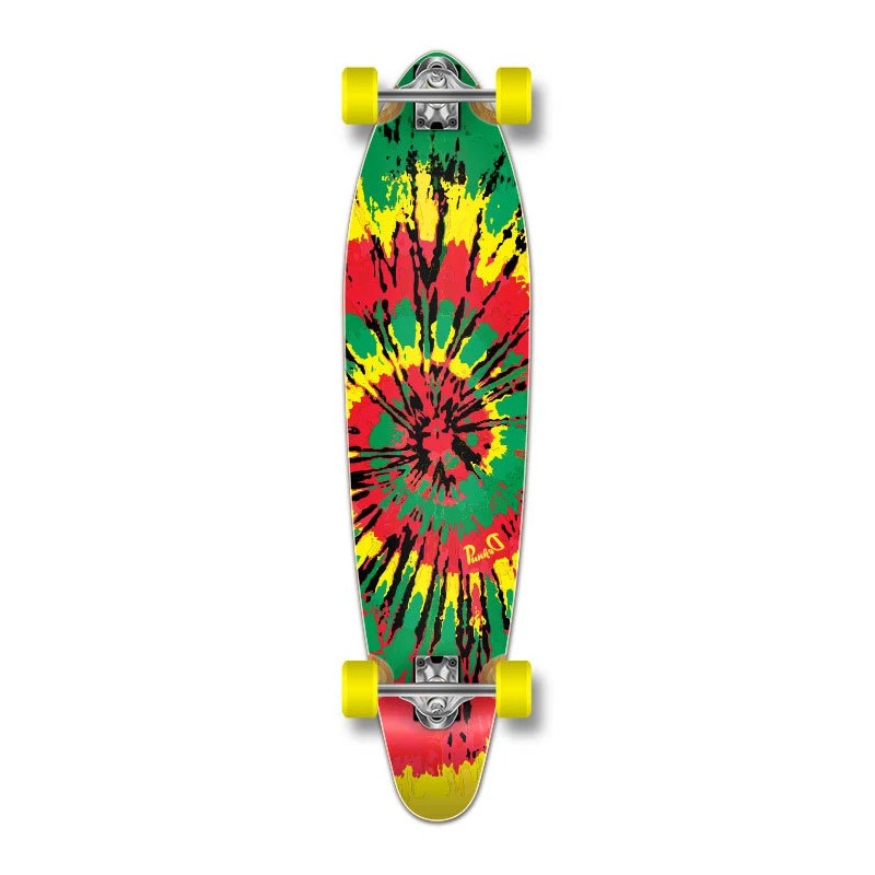 Complete TieDye Series Kicktail Longboard The Kicktail is similar to the pintail shape, but the kicktail shape has a few different features that allows the deck to give the rider more utility. It features a low grade of concave and a kicktail to give riders a more control when riding. TieDye Original Original TieDye swirl with standard yellow,blue, red, and orange
