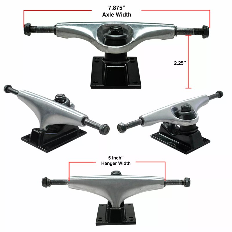 * Trucks: Polished/Black 2 Tone 125mm HD5 Trucks, 125mm Hanger, 7.675" axle to axle, Constructed with Aluminum Alloy, Grade 8 Kingpin, 90A PU Bushing