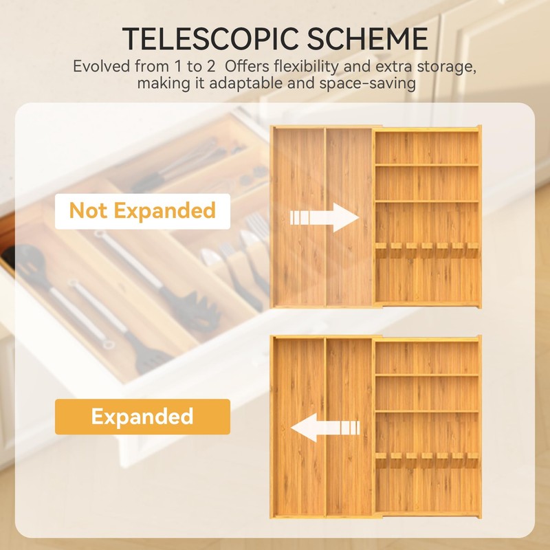- 【Pure Natural Bamboo Utensil Drawer Organizer】: Our kitchen drawer organizer is made of naturally regenerated bamboo, and the entire silverware drawer organizer is made of pure bamboo material. Bamboo material is not as easily damaged as plastic silverware drawer organizer, nor as moldy as wooden cutlery boxes, making it the best helper in the kitchen