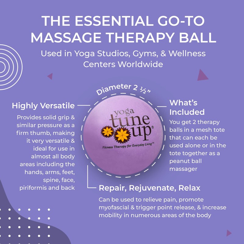- THE ESSENTIAL GO-TO MASSAGE THERAPY BALL: at 2 ½ inches in diameter & with a grippy texture, the original Yoga Tune Up balls are extremely versatile, applying pressure similar to a thumb, that can really penetrate in just the right place & way to provide needed pain relief & release of muscle tension.