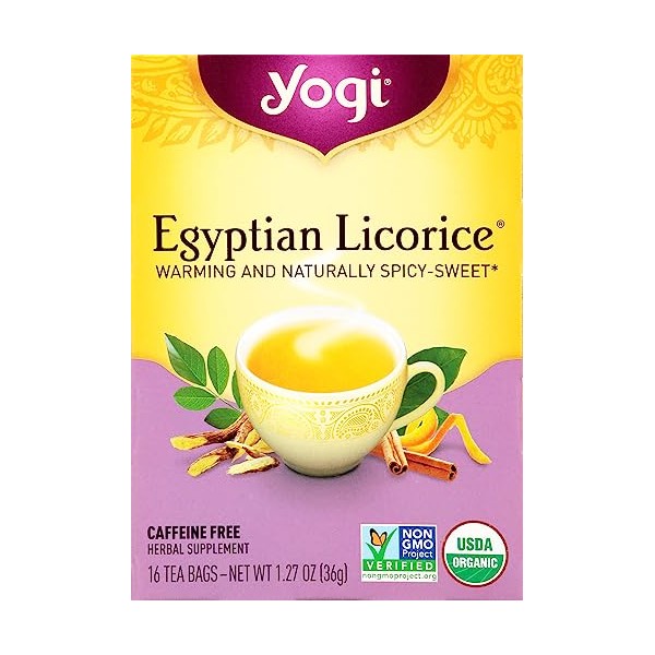 - FLAVOR: Yogi Egyptian Licorice tea combines rich Licorice Root with Cinnamon, Cardamom, and Clove for a deliciously spiced and naturally sweet herbal tea blend.
