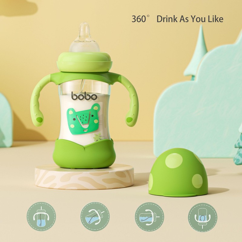 - Our baby bottles also come with a unique gravity ball design that allows your baby to drink at will. The bottom is equipped with a thick rubber cover to make the bottle more stable. Removable handle makes it easier for your baby to hold.