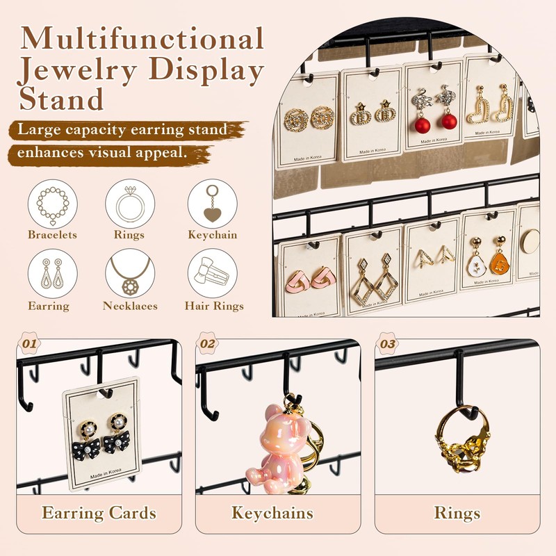 - ✨Jewelry Display Stand for Vendors: This jewelry earring display for selling has 5-tier and 130 hooks, which can display up more earrings and earring cards. Display your earrings in four sides, increasing display opportunities.