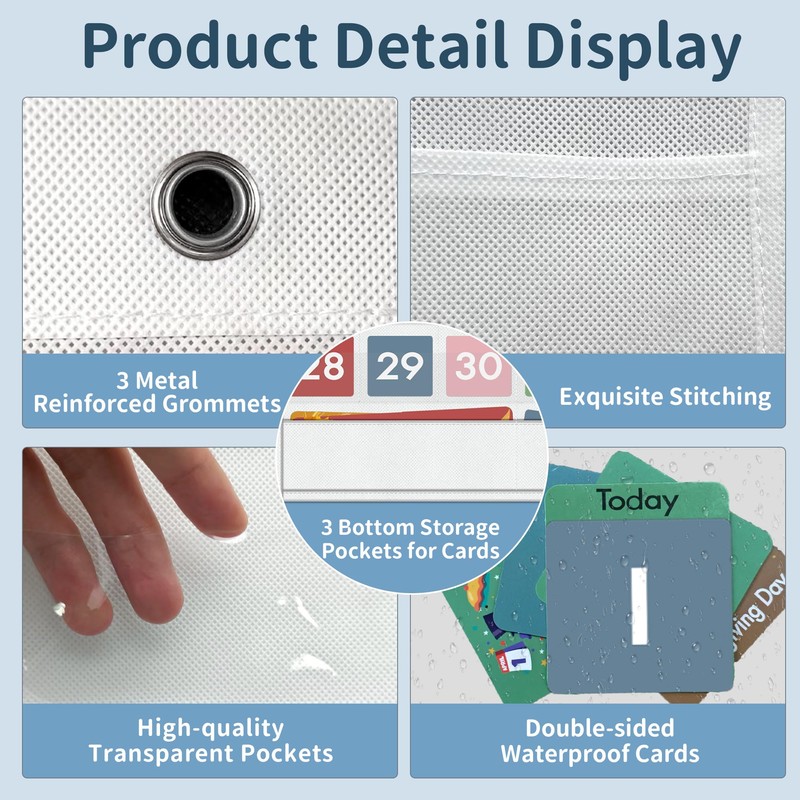 - High Quality Materials: Made of high-quality non-woven fabric and transparent PVC pockets with reinforced stitching. Features eco-friendly colored cards and 3 reinforced metal grommets that make it easy to hang on a wall, whiteboard, behind a door or on most standard chart holders
