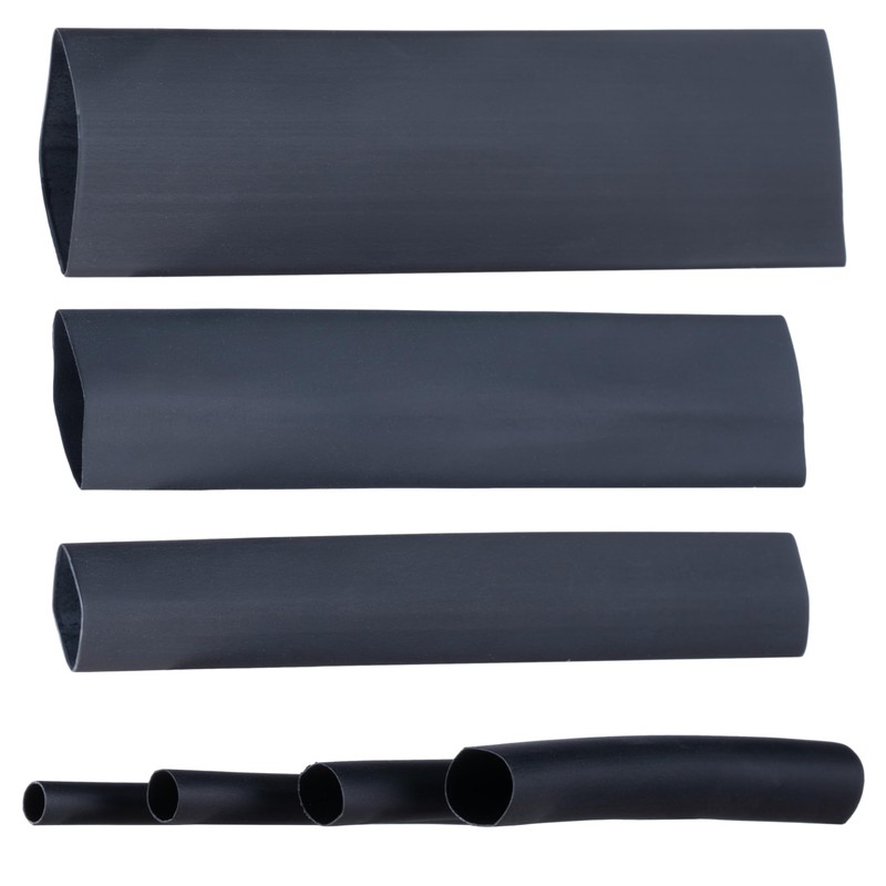 The black polyolefin sleeves feature a 2:1 shrink ratio to ensure they contract to half their original diameter, ensuring good wrapping. The hose is easy to apply, requires only a heat gun to achieve complete shrinkage at 110°C while contracting at 70°C.