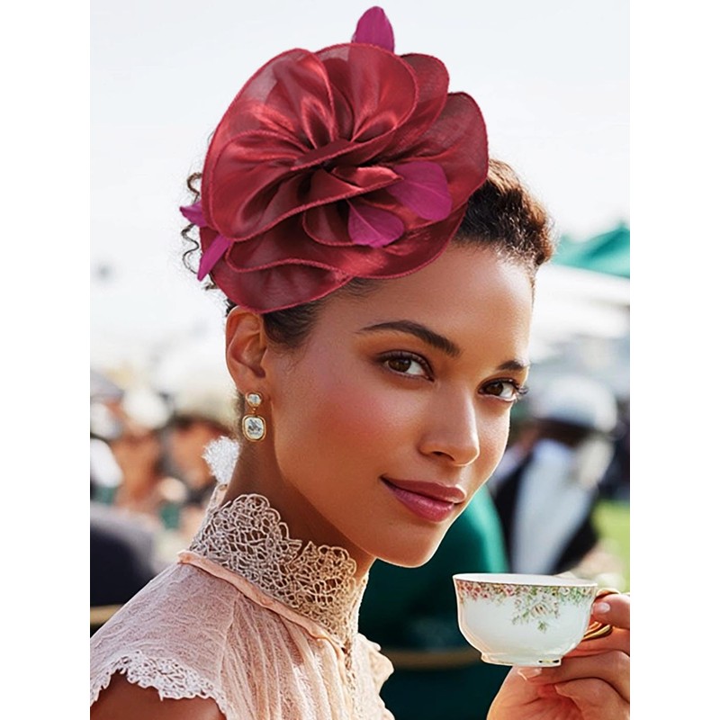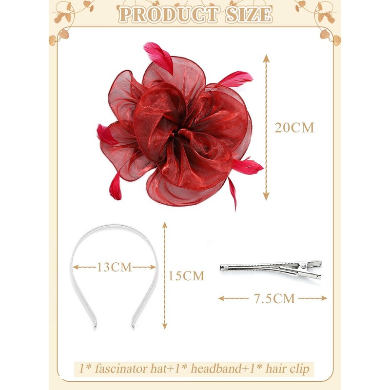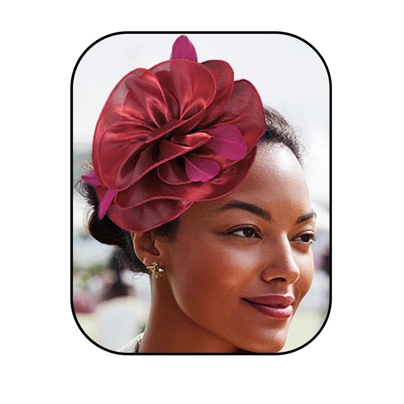- Instant Style Transformation: Be the centerpiece at any event with this 3D floral/feather composition. The tea party hat's neutral color palette (vine red) coordinates effortlessly with dresses while adding 9" diameter visual impact.