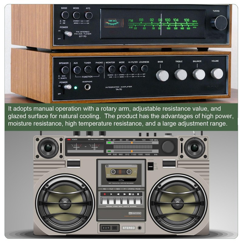 √MULTIPURPOSE: Disc adjustable resistors are often used in musical instruments such as guitars to adjust the volume and tone. In guitars, potentiometers (adjustable resistors) change the resistance value by turning the knob to control the volume and tone. In addition, disc adjustable resistors are also widely used in other electronic devices that require precise adjustment of resistance values, or in situations where circuit currents are adjusted or circuit resistance values are changed, such as voltage and current regulation in industrial electrical equipment; voltage adjustment of AC and DC generators; speed regulation of small DC motors. For example, it can be used to adjust the brightness of lights, control the start and speed of motors, or be used as audio control in audio equipment.