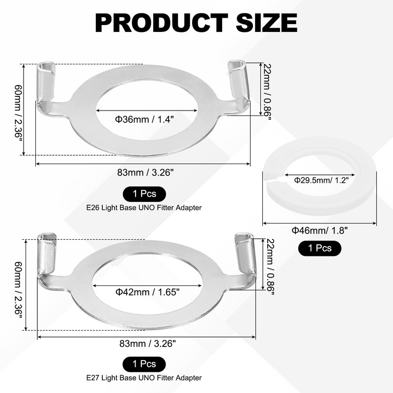 - Specification of The Product: Color: Nickel; Material: Metal, Plastic; E27 Lamp Harp Saddle Base Dia: 42 mm/ 1.7 inch; E26 Lamp Harp Saddle Base Dia: 36mm/ 1.4 inch; UNO Collar Ring Adapter Dia: 27 mm/ 1.06 inch; Packing List: 1 Set x Lamp Harp Saddle Base.