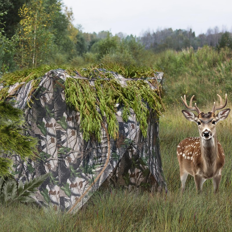 - FULLY INTEGRATED INTO THE ENVIRONMENT: This see-through blind boasts a camouflage pattern and brush-in loops for hanging leaves for added concealment. Silent hooks replace zippers, ensuring you can observe your prey without detection.