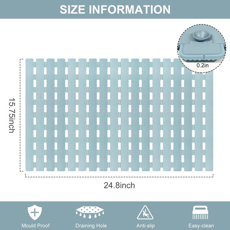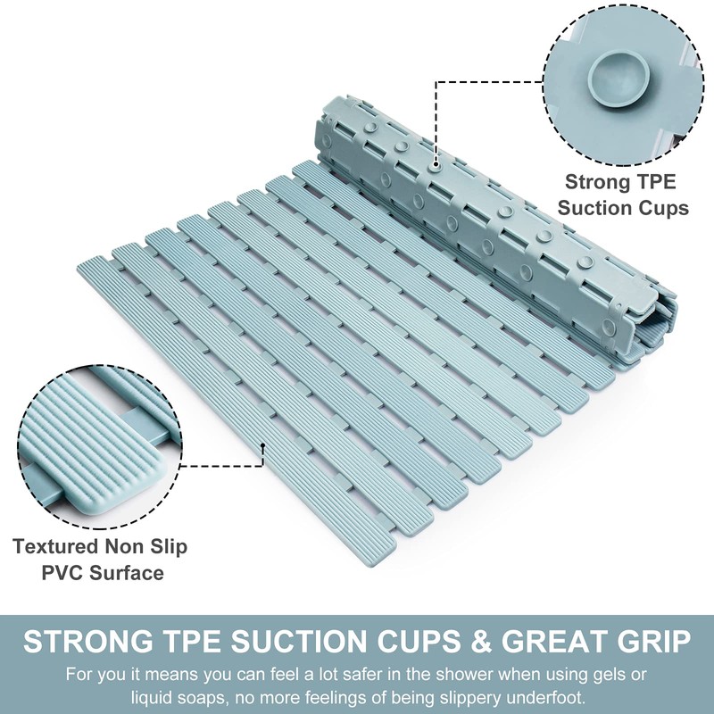 - PERFECT DRAINAGE SYSTEM: The stripe design is elevated with drain hole slotted panels allowing the water/soap/hair/air/etc flow underneath and not accumulate around your feet is wonderful, it make the mat keep clean , roll it up and stand it on the edge can quick dry