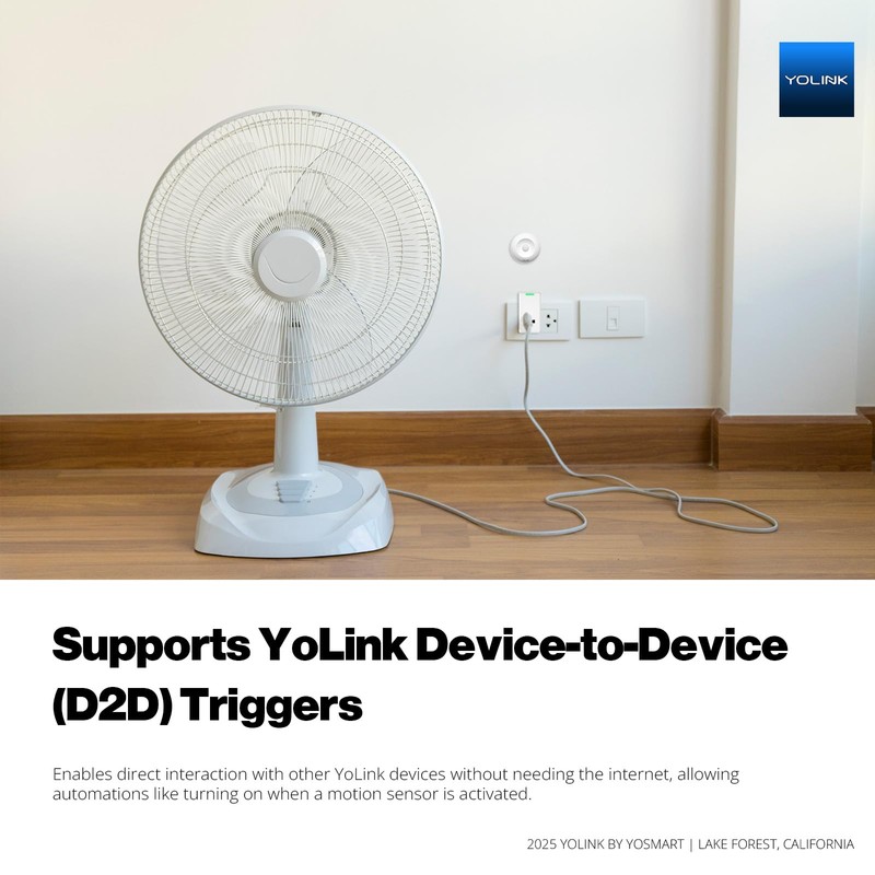 - Supports YoLink Device-to-Device (D2D) Triggers – Enables direct interaction with other YoLink devices without needing the internet, allowing automations like turning on when a motion sensor is activated.