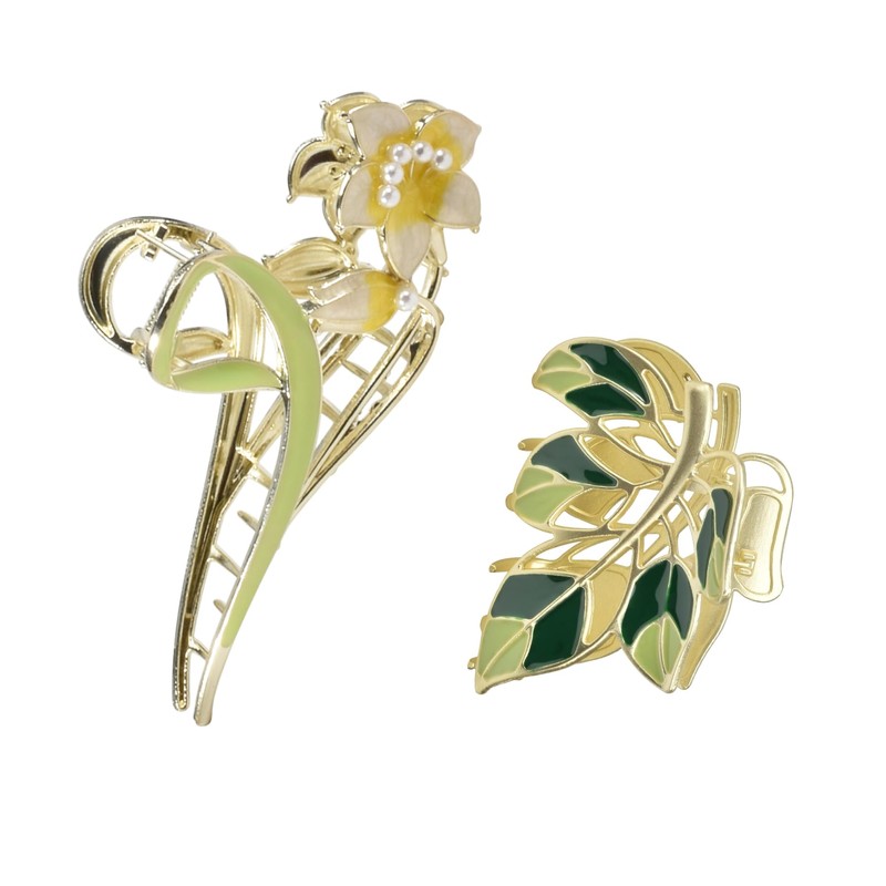 Yonchic 2-Piece Multiple Shapes Metal Hair Clips, Lily Hair Claws for Thin/Medium Thick Hair, Elegant Leaves Barrettes Strong Hold Hair Clamps Non Slip Cute Hair Catch Clip Accessories