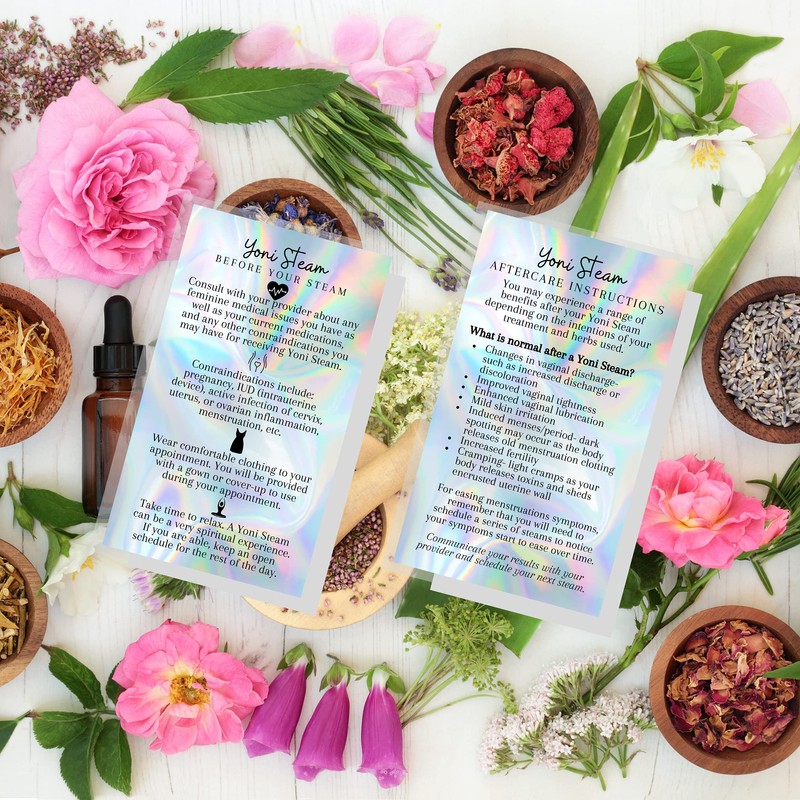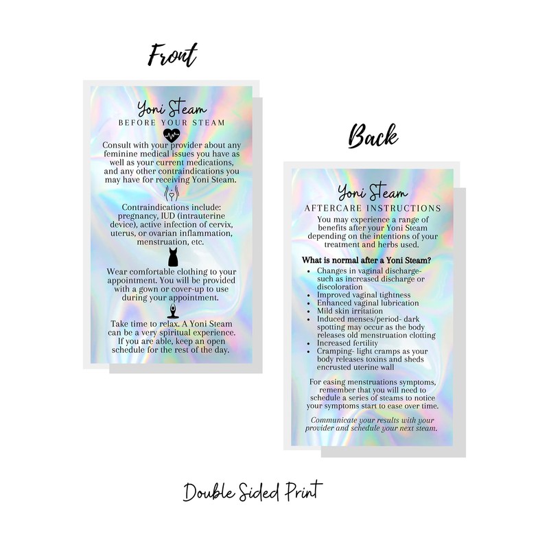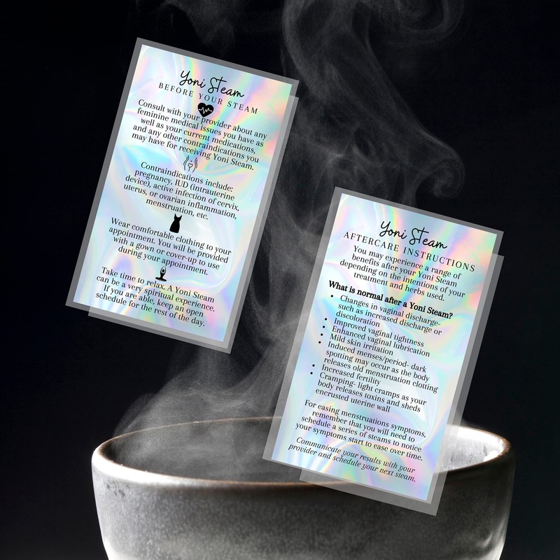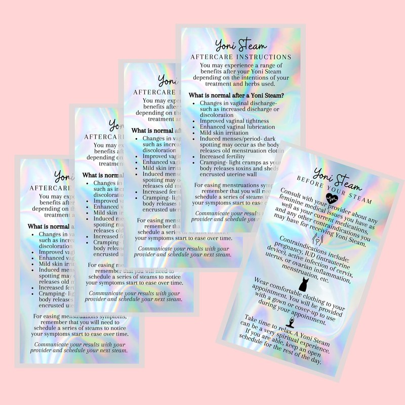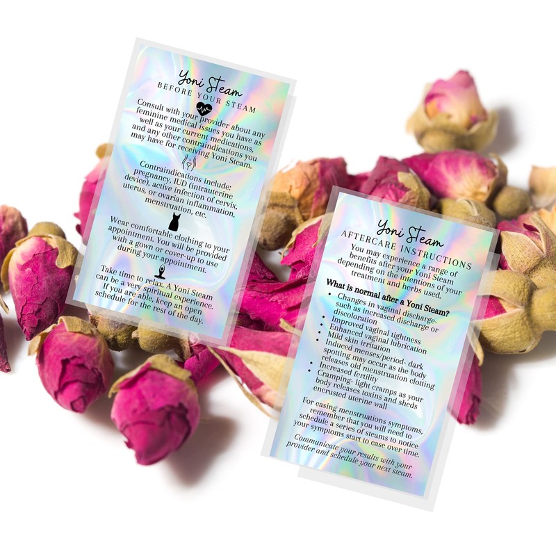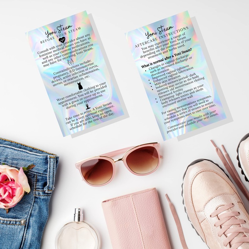 Yoni Steam Pre/Post Steam Care Instruction Cards | 50 Pack | 2x3.5” inch Business Card Size | Non-Reflective Matte Rainbow Holographic Look Design
