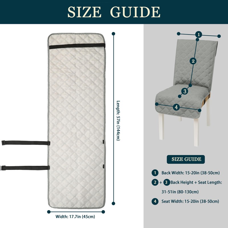 - Size Dimension: The size of the entire chair cover is 17.7 "width x 57" length, suitable for chair back width 15 "-20". Backrest height and seat length combined is 31 "-51", and the seat width is 15 "-20". Please measure the size of your chair before purchasing.