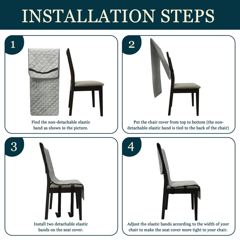 - Non-slip design:The dining room chair covers adopt 3 adjustable straps, one is tied to the backrest and other two tied to the chair seat, providing users with a comfortable seating experience. There are also large anti-slip particles on the back, it can more effectively fix the chair covers on the chair without sliding.