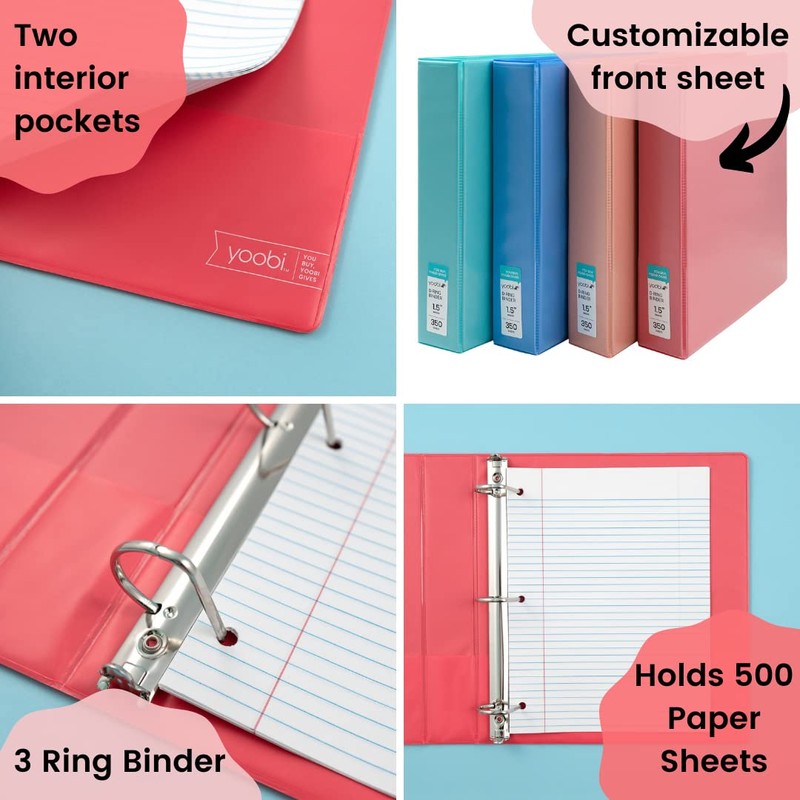- Variety pack of (4) 1.5 inch 3-ring binders in coral, blush, mint, and blue each have a customizable front sheet and spine insert