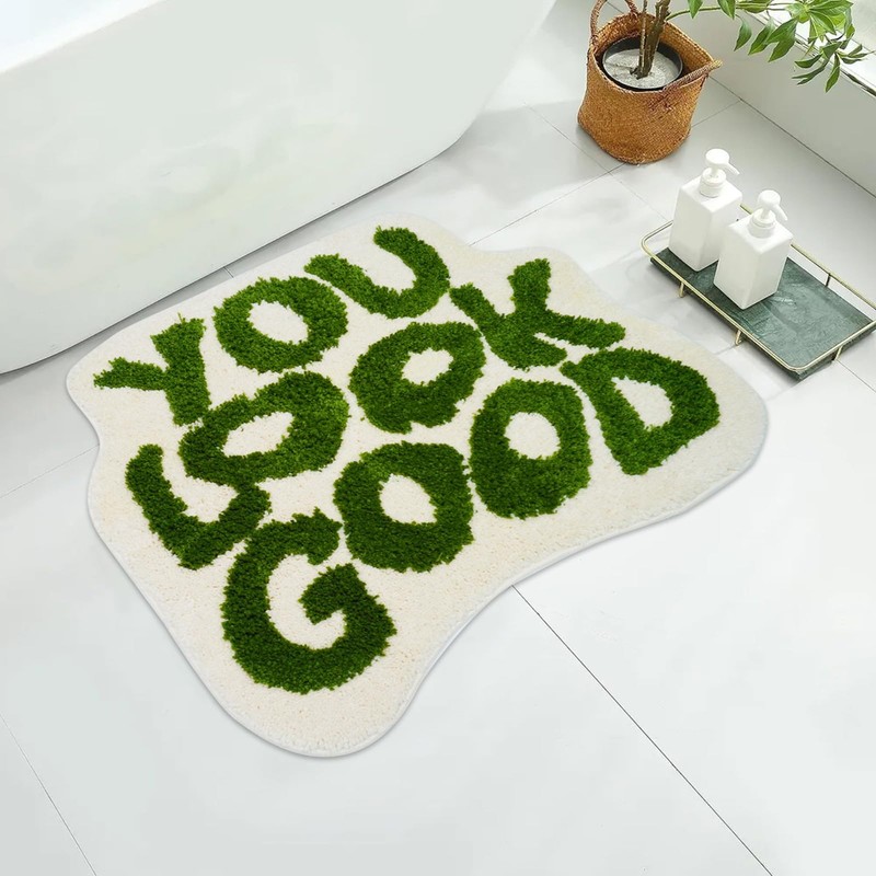 YOOCHUENG Bath non slip mat printed with you look good alphabet style,with bright colours are very bright.The surface is soft flocking,which not only provides comfort but also absorbs water quickly.The back has a non-slip rubber design,but be aware that you will need to be careful when walking on the ground when there is too much water.