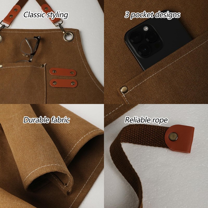 Yoocixu Heavy-Duty Canvas Work Apron with Cross-Back Straps, Multiple Pockets, Brown Cotton, Waterproof Design for Garden, Kitchen, Workshop
