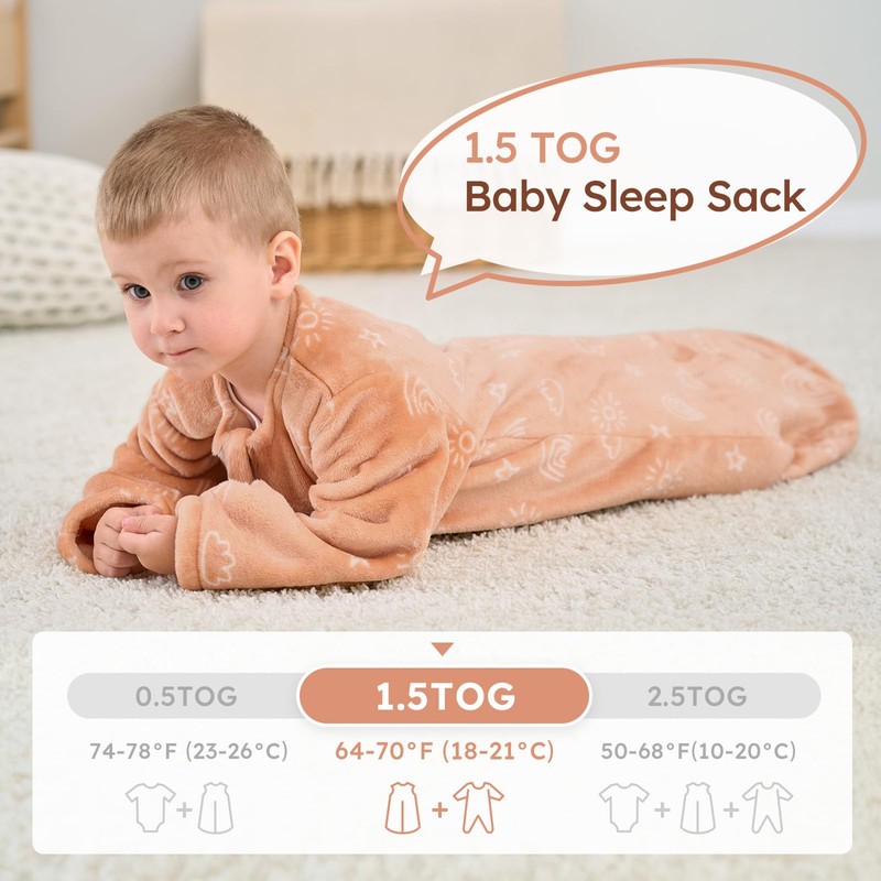 - 1.5 Tog Sleep Sack with Sleeves: Long sleeve design offers freely arm movement and warmth. 1.5 Tog sleep sack with sleeves is suiable for moderate temperatures from 69 to 73°F as an ideal option for autumn, early winter and spring or taking a nap in cool summer A/C room during the summer.