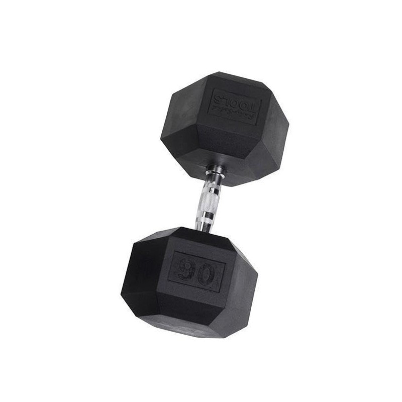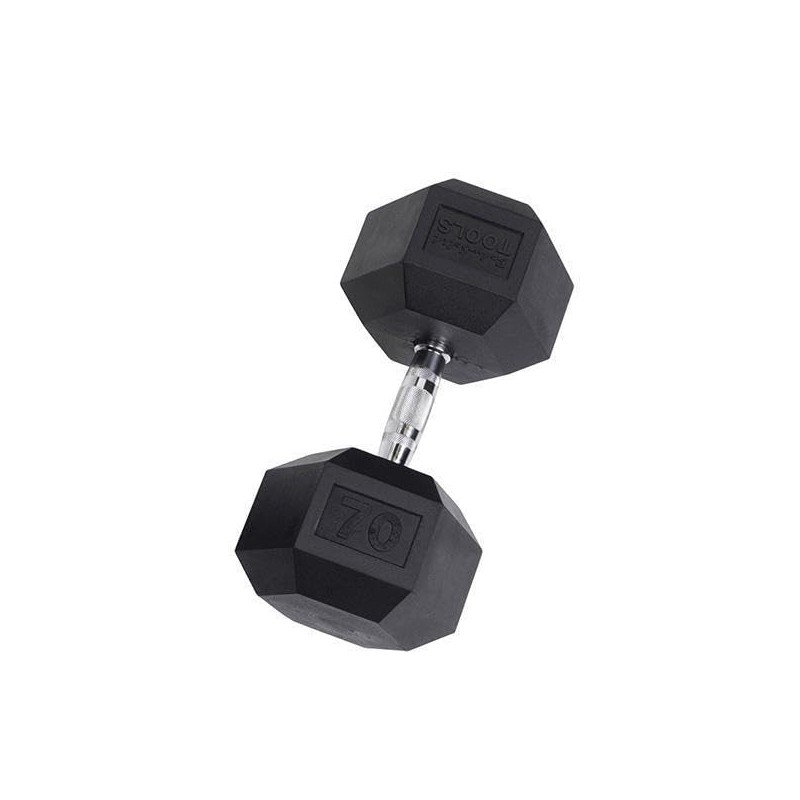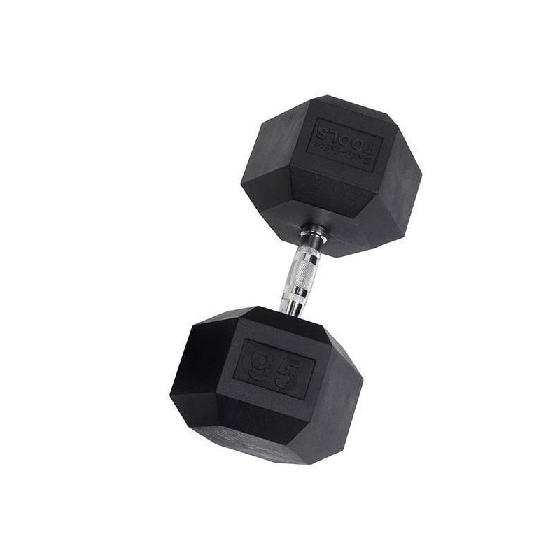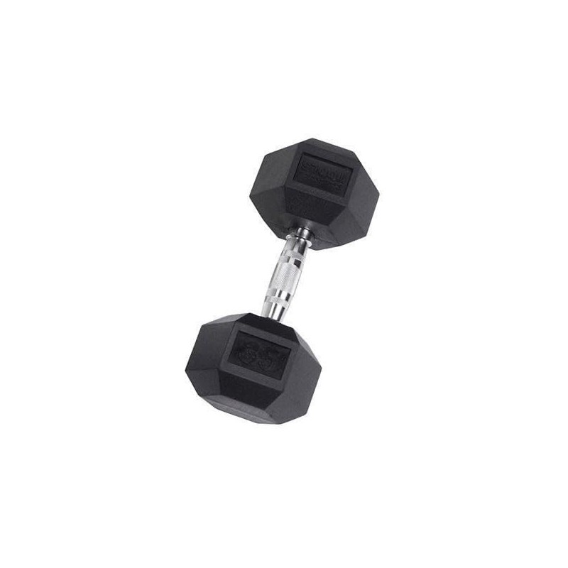 The Rubber Hex Dumbbell features durable rubber-covered heads for increased safety and comfort. The rubber coating increases durability, protects flooring and equipment, enhances appearance, diminishes noise, and is easy to clean. The heads are permanently affixed to a thick solid steel shaft improving the strength of the head / handle joint. The knurled chrome handles are ergonomically contoured to fit comfortably in the palm of the user. Rubber Hex dumbbells are a great addition to any workout space.