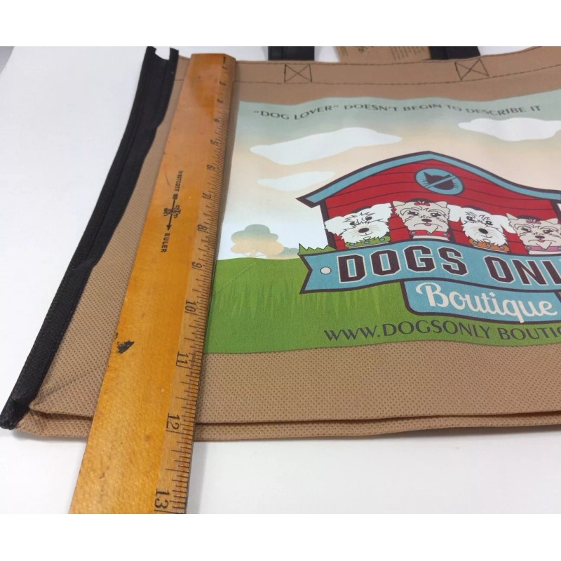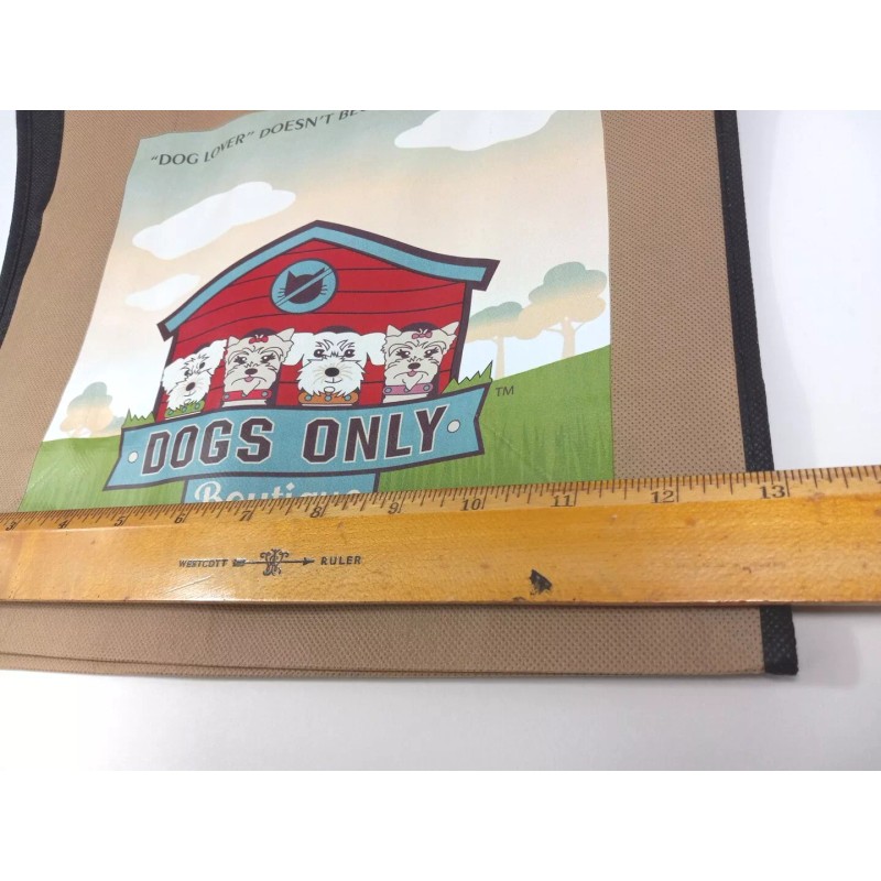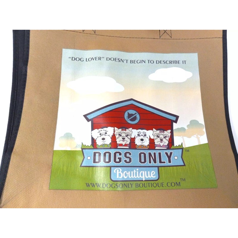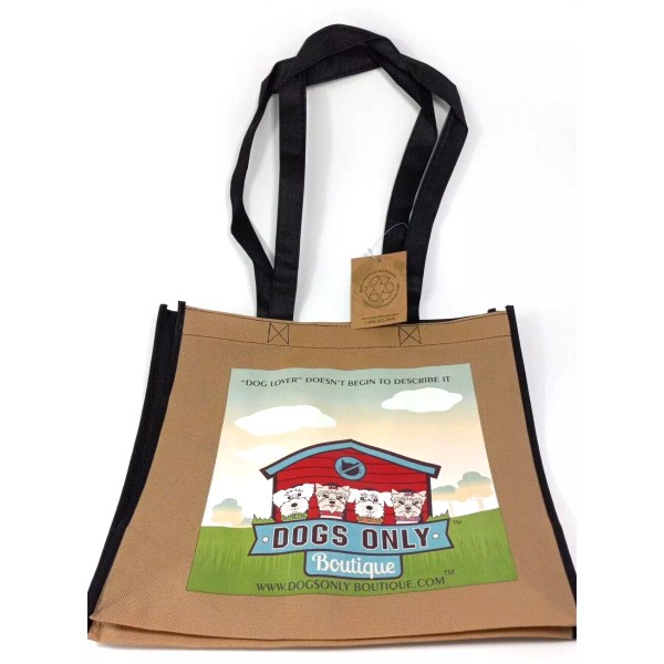 Dog Lover Tote reusable Shopping Bag Shoulder Strap Ecolife brand.NWT. 12x12 brown bag black straps bag. On front of bag, "dog lover doesn't begin to describe it" "dogs only boutique" 4 dogs/yorkies in front of doghouse with "no cats sign above". Along bottom www.doghouseboutique.com. Discontinued stock. See pictures for measurements. Will combine shipping on multiple orders. Shipped from smoke free environment. Fast shipper!