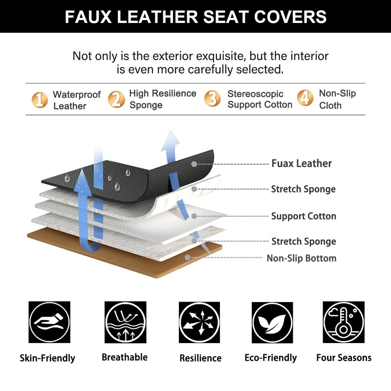 - 🚘Premium Material:The car seat cover full set is made of high quality leather,high resilience sponge and non-slip bottom,soft,comfortable and easy to clean.Waterproof car seat cover easy to keep clean by wiping with a damp towel.