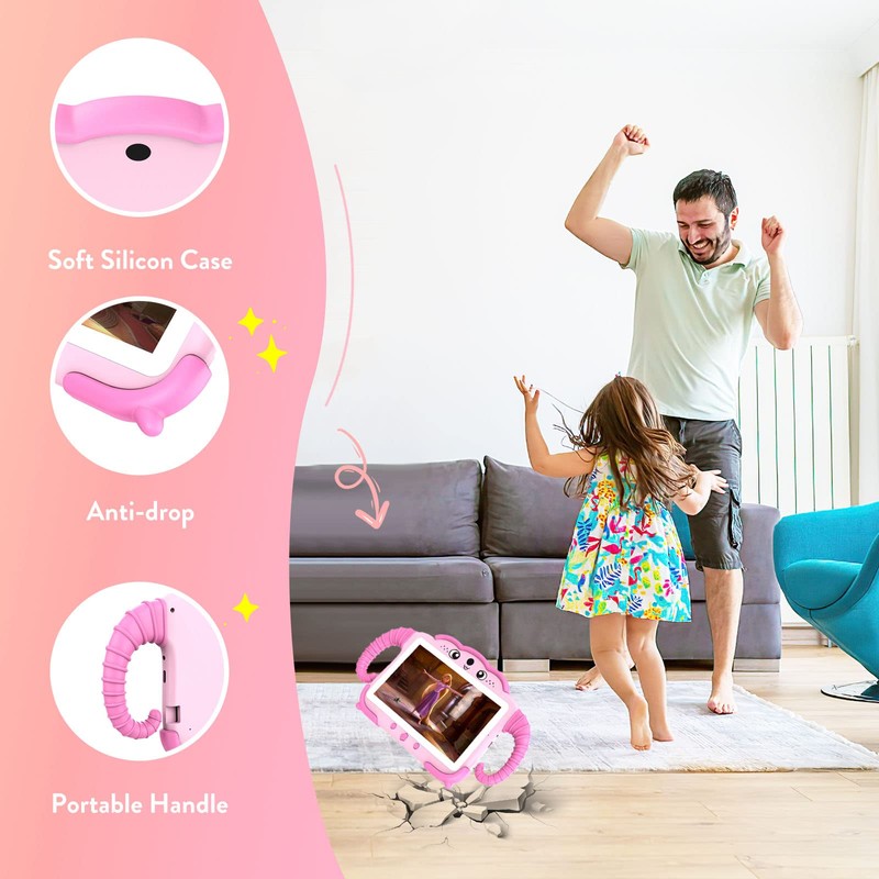 - Kids Friendly Tablet With Case: The top and bottom of this kid tablet are surrounded by a soft silicone case, which can protect the screen against occasional drops or bumps. The carrying handle is not only suitable for children's small hands to hold, and can also be used as an adjustable bracket for children to watch