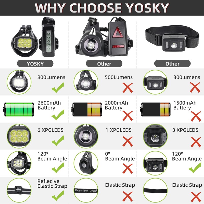 YOSKY 800 Lumen Chest Light, Running Light for Runner with Reflective Straps, Rechargeable Running Headlamp Flashlight, Adjustable Safety Lights Beam for Walking Dog at Night, 4-8h USE TIME