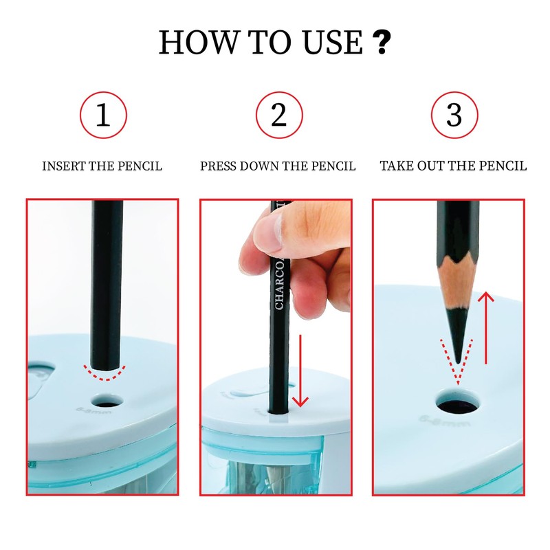 • ✅【DUAL HOLE DESIGN】:Features two sharpening holes to accommodate both normal and jumbo size pencils, ensuring versatility and convenience. Small hole for 6-8mm pencils, large hole for 9-12mm pencils.