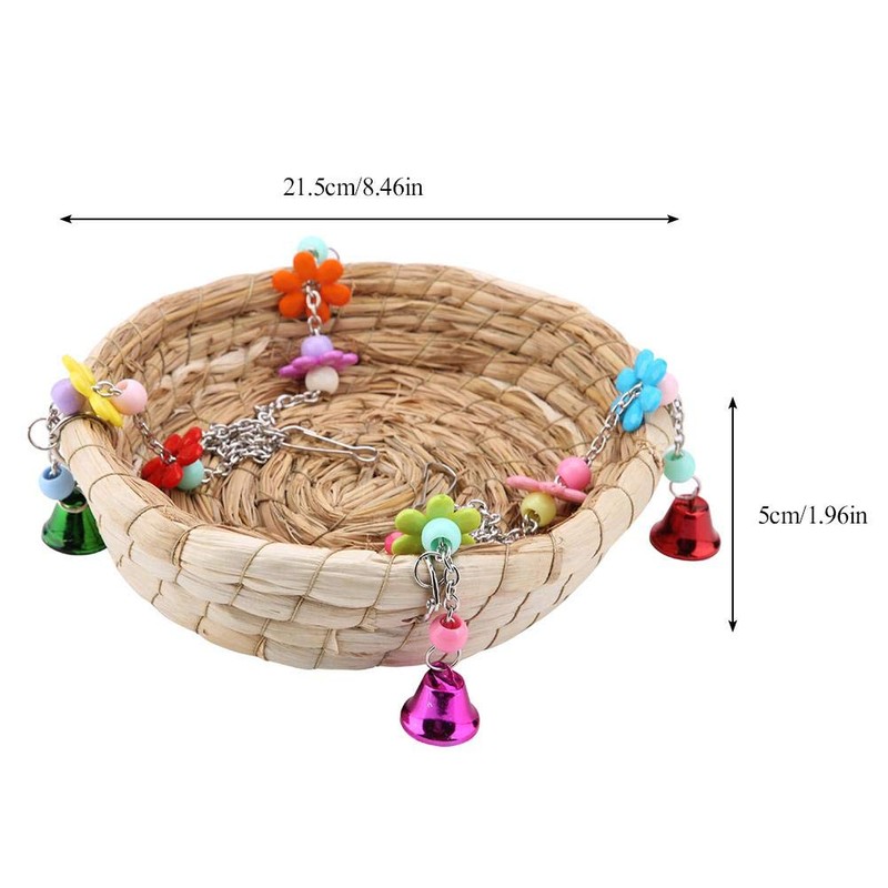 Material de paja de , seguro y no tóxico, inodoro y saludable. Uso multipropósito: puede ser utilizado como nido de pájaro; También se puede utilizar como columpio. Está diseñado con las campanas, que pueden atraer la atención de las aves, divertidas para jugar. Reutilizable y duradero: el juguete para pájaros se puede usar repetidamente y es duradero para un uso prolongado. Su ave puede descansar en el juguete, lo que puede aliviar la presión de la ave.