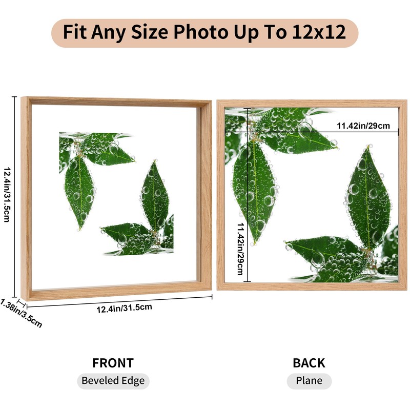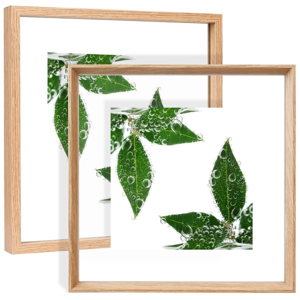 YOTINTIN 12x12 Floating Frames 2 Pack Wooden Photo Frame Double Sided Glass Picture Frame for Any Size Picture up to 12x12, Wall Mount or Tabletop Displays, Double-edged Frames, Natural