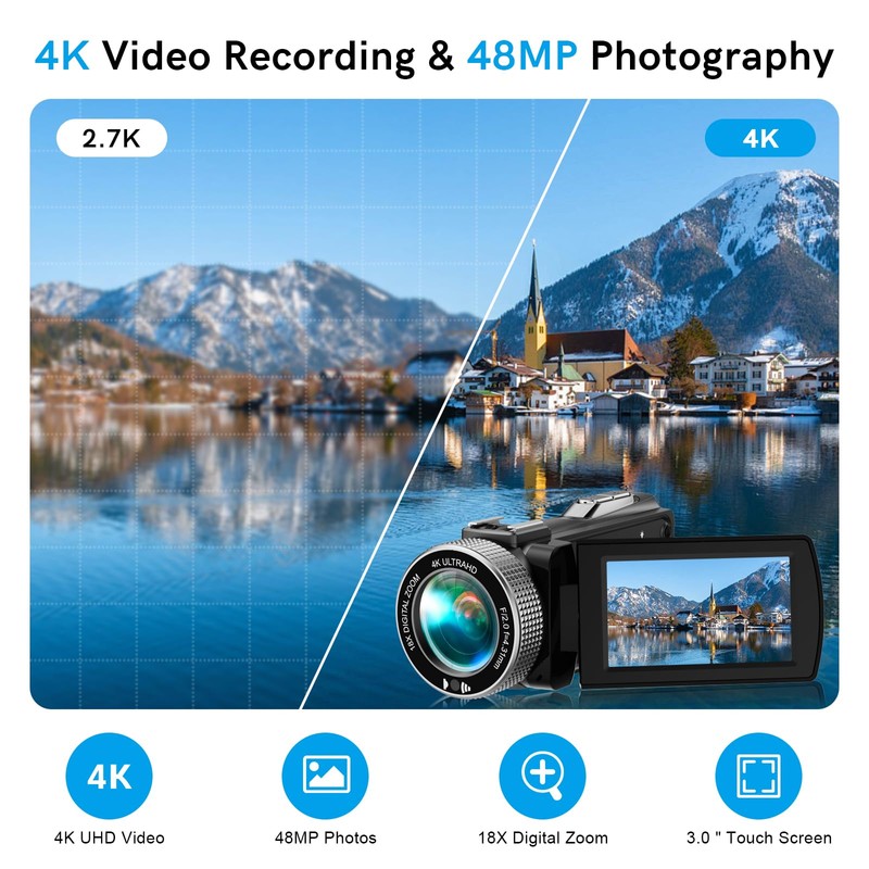 - 【Flexible Framing】: The Video Camera comes with 18X Digital Zoom, you can zoom in on distant travel spots or subtle moments for Youtube/vlogs—no need to move closer. Never miss key shots, adding versatility to your content.