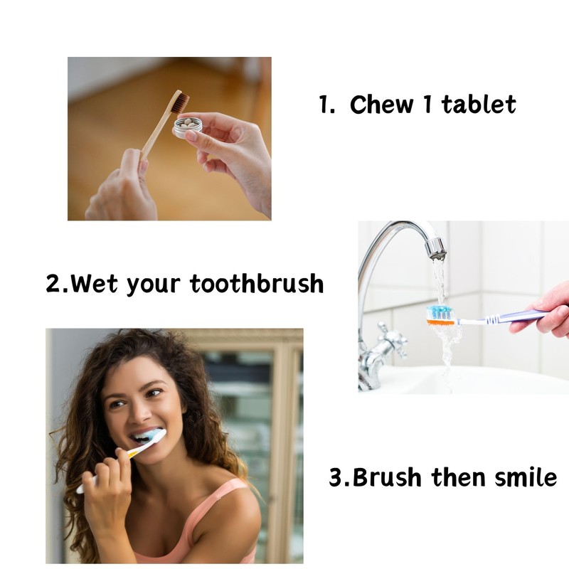 - HOW TO USE - Pop a tablet in your mouth, chew it up, wet your toothbrush before brushing as usual. Rinse, spit out and then smile.