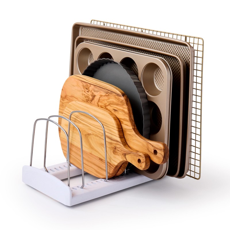 • EASY SET-UP: Just pull the rack out of the box, insert steel dividers, and load your items. A quick set-up means your bakeware will be neatly organized before dinner.