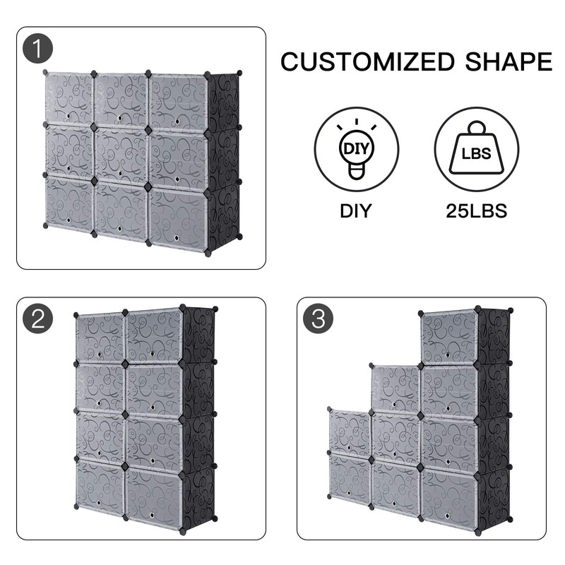 - 【LARGE CAPACITY AND SIZE】48"(W) x 12"(D) x 48"(H). 4-Row 3-Line 12 cubic Shoe Rack can hold up to 48 pairs of shoes in normal size perfectly. The test results show that each cube can support more than 25 lbs. The spacious shoe organizer has enough space to store different kinds of shoes from loafers to heels, and larger compartments for boots.